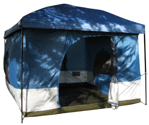 MUST HAVE CANOPY FRAME! FRAME NOT INCLUDED The Fast Up "Standing Room" tent is an excellent shelter with vertical walls that most people can stand straight up in. If you are tall and want a tent with headroom, this tent has over 8 feet of height at the center, and the vertical walls allow use of the full floor space The tent and the gazebo come separately and nearly any 10'x10' (straight leg) canopy or gazebo can be used as a cover and the support for this tent. The tent by itself comes with a solid waterproof top that is covered and sheltered from rain and sun by the gazebo or 10'x10' canopy tent roof insuring a weather proof environment . Other features include two Power Cord outlets that velcro shut as well as four storage pouches located conveniently around the walls of the tent. Two doors allow easy access to and from and allow two or more tents to be "stacked" together. The doors and windows all zip shut to keep rain and bugs out, and the tent has a tub style floor, so it is completely enclosed. The tent itself hangs from the canopy by hooks at the four corners. It is a great family tent with room in the 10' X 10' model for two queen sized air mattresses or air beds and 5 sleepers. Another nice feature is the simplicity and ease of setting it up, so that even the youngest campers can jump in and help and be effective. Easily set up in under 10 minutes.MUST HAVE CANOPY FRAME! FRAME NOT INCLUDED