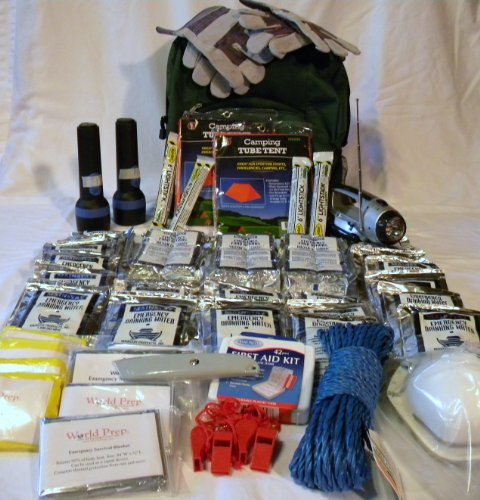 FREE SHIPPING INCLUDED--Basic survival supplies for a family of 4 for 3 days as recommended by the Red Cross. The kit includes the following: * 6 large -Pouches of Drinking Water - each pouch has a 5 year shelf-life * 3 - 3500 Calorie Food Bars - 5 year shelf-life * 1 - Hand Crank AM/FM/ Band Radio also can use the included batteries. * 2 - Hand Flashlight with batteries * 4 Survival Whistles, waterproof container, * 4 - Thermal Blankets (Retain 90% of Body Heat) - Recommended over common "space blankets" * 4 - Emergency Poncho with Hood * 2 - 2 Person Tube Tent with Rope * 1 utility Knife * 2 - Pairs Leather Palm Gloves * 1 - 30 Foot Rope* 4 - N95 Masks* 1 - 42 piece First Aid Kit - contains the essentials needed for any type of fist aid emergency * 4 - 12 Hour Light Sticks